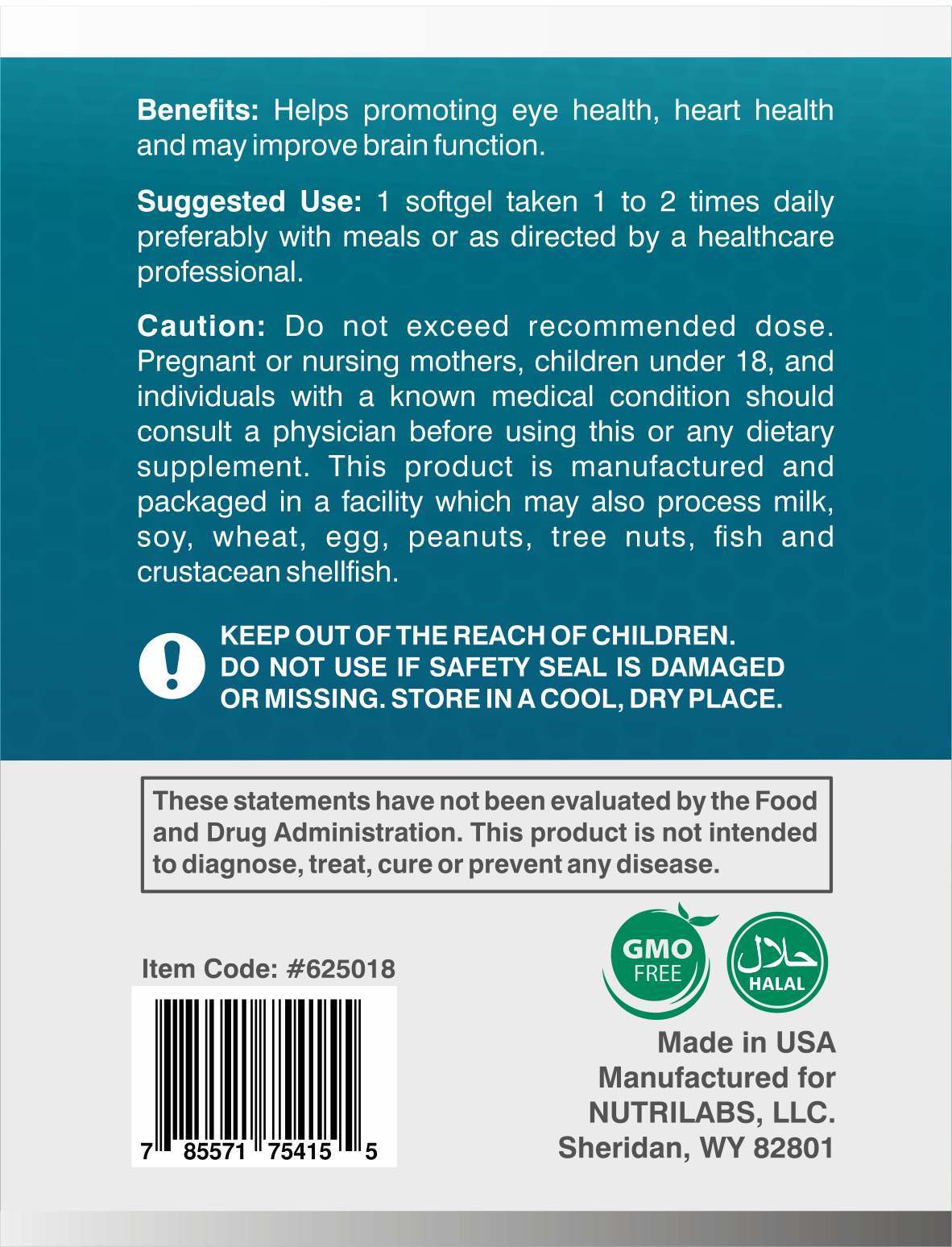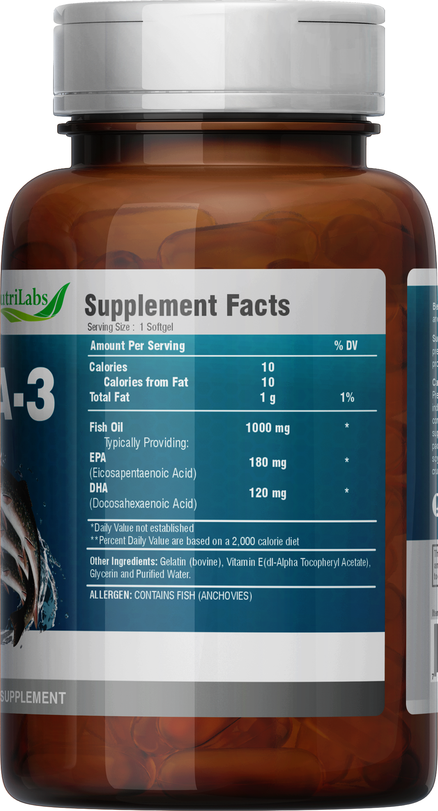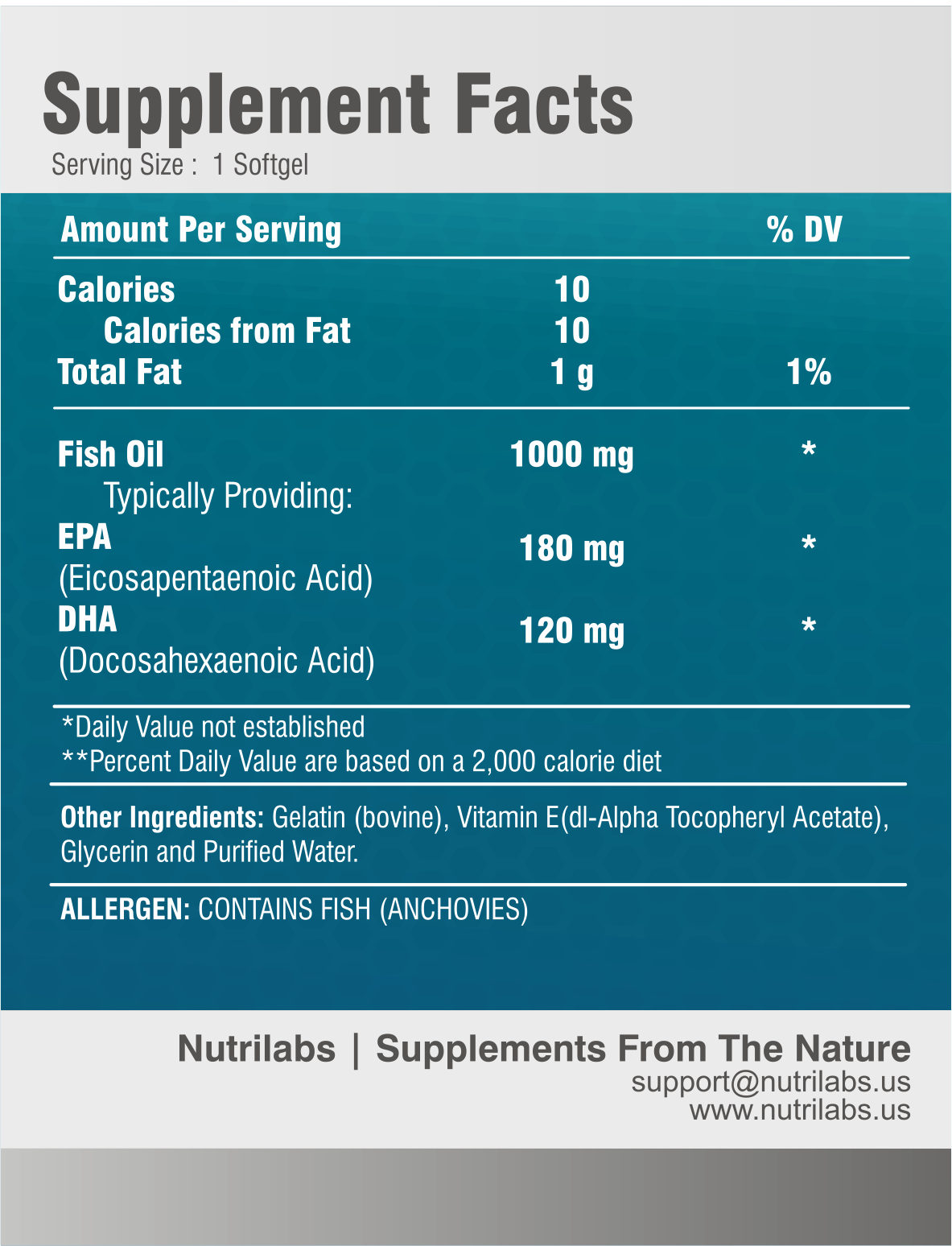 Non-GMO Formula! Nutrilabs Omega-3 Fish Oil is a 1,000 mg fish oils consisting of EPA and DHA from wild caught anchovies. Our product has been PCB tested and guaranteed to be within Proposition 65 limits.