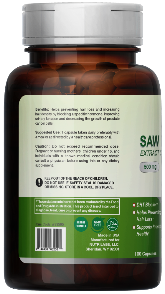 Herbal-Formula! Using the best herbal ingredients, we collect and extract it into Nutrilabs Saw Palmetto 500 mg. The power of nature to prevent hair loss and support prostate function.